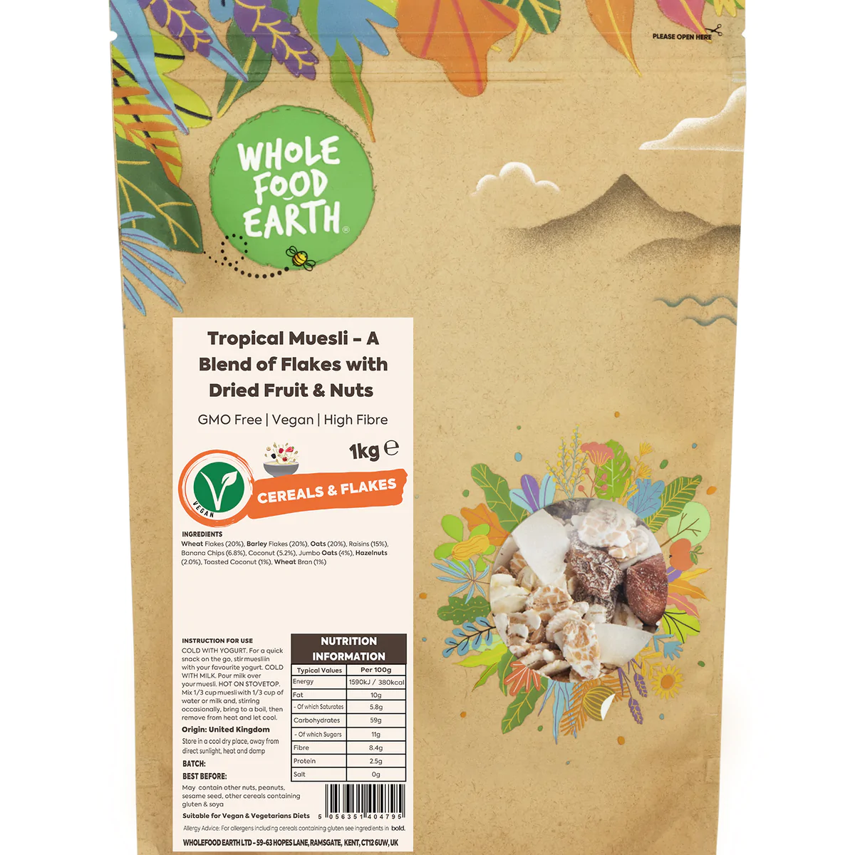This Tropical Muesli is a nutritional boost with its mixture of Wheat &, Barley Flakes, Oats, Raisins, and Banana Chips, including hazelnuts! (for the full list please read below)