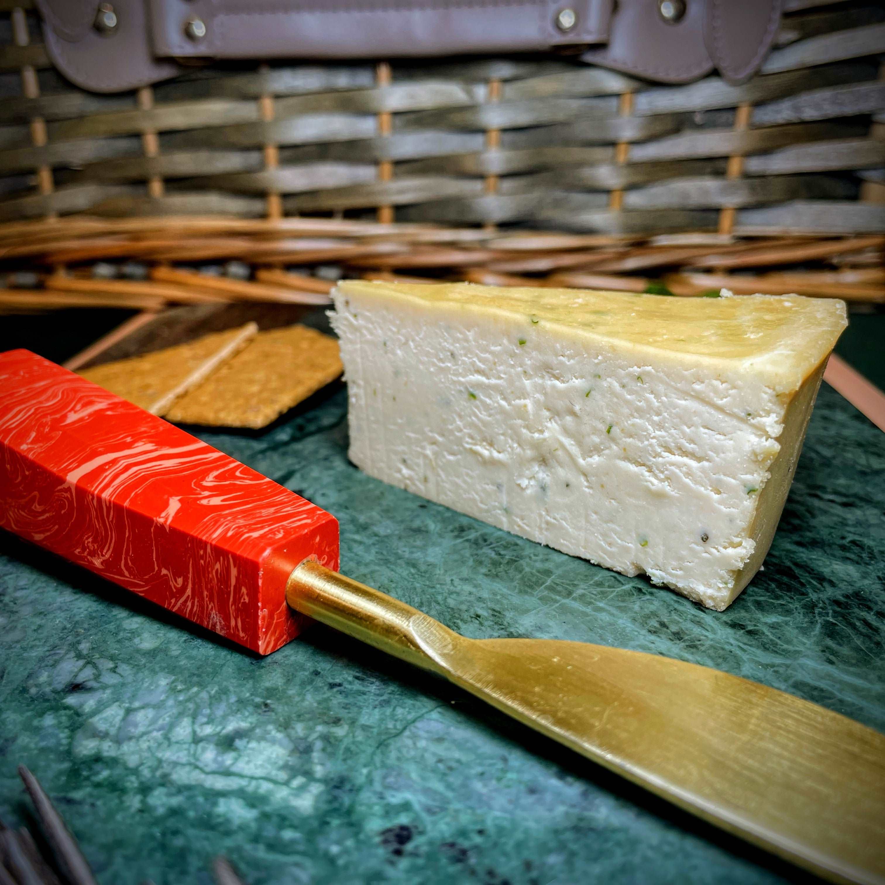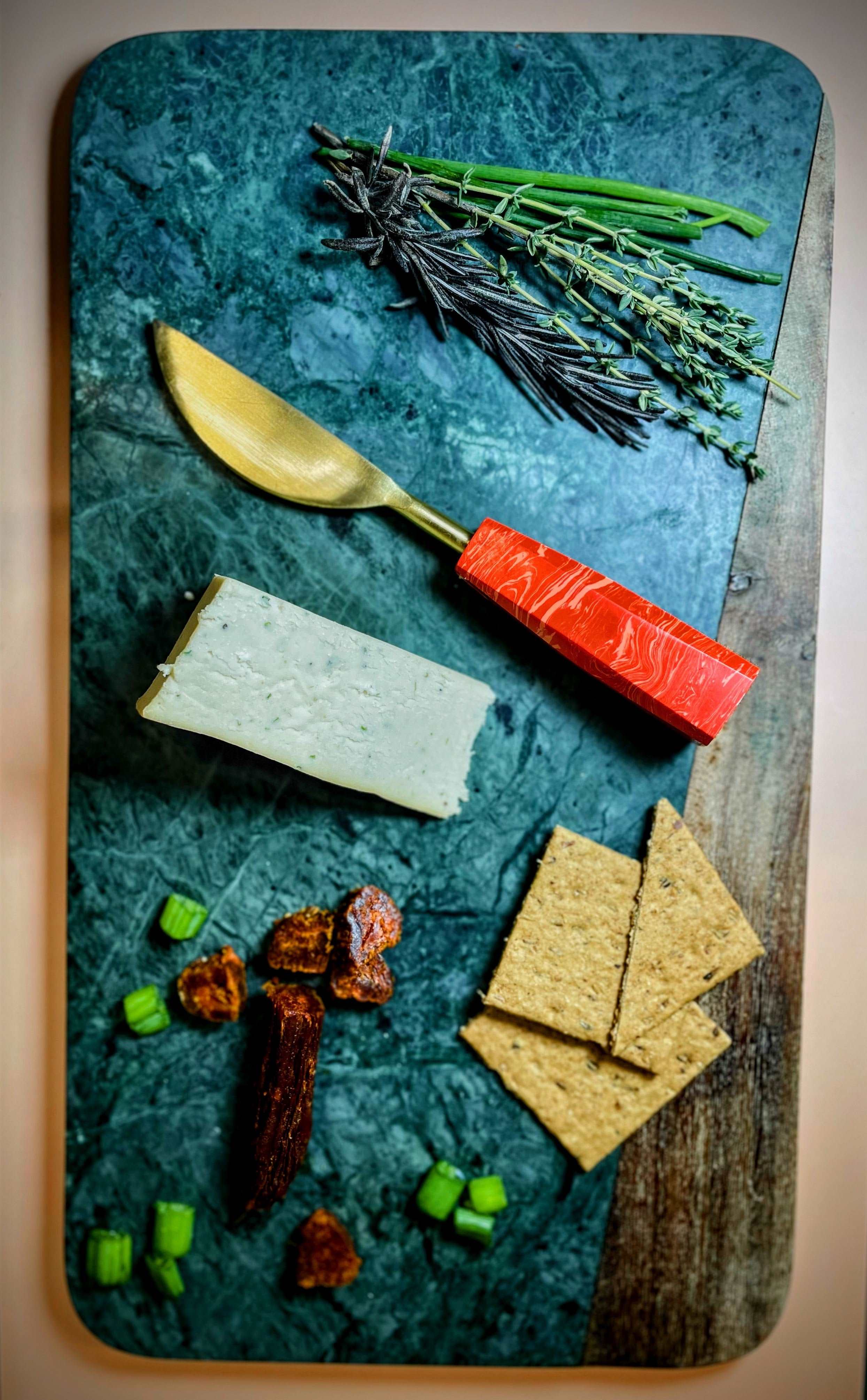 Clapton Chive is a tangy, savoury almond cheese with bold garlic notes and fresh herbs. This cheese is a delicious alternative to a Double Gloucester or Boursin, that we love to spread on crackers and toasted bread.