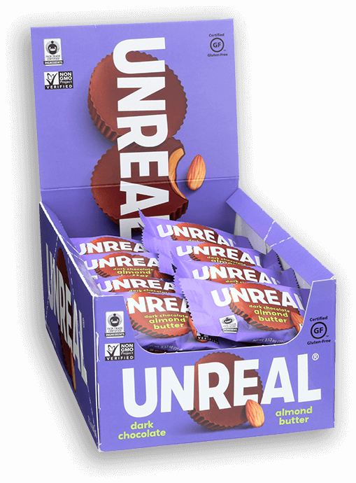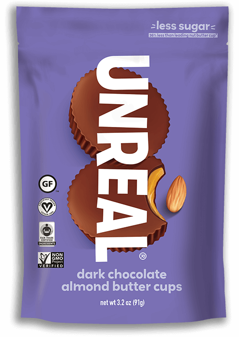 Where almonds and dark chocolate live the good life! Rich, chocolaty goodness combines with creamy almond butter for a melt-in-your-mouth treat that can satisfy even the most nagging sweet tooth. But, unlike other options, these chocolates are dairy-free, gluten-free, soy-free, and vegan. UNREAL is on a mission to change the world, one snack at a time… That’s one non-gmo, nothing artificial, respo...