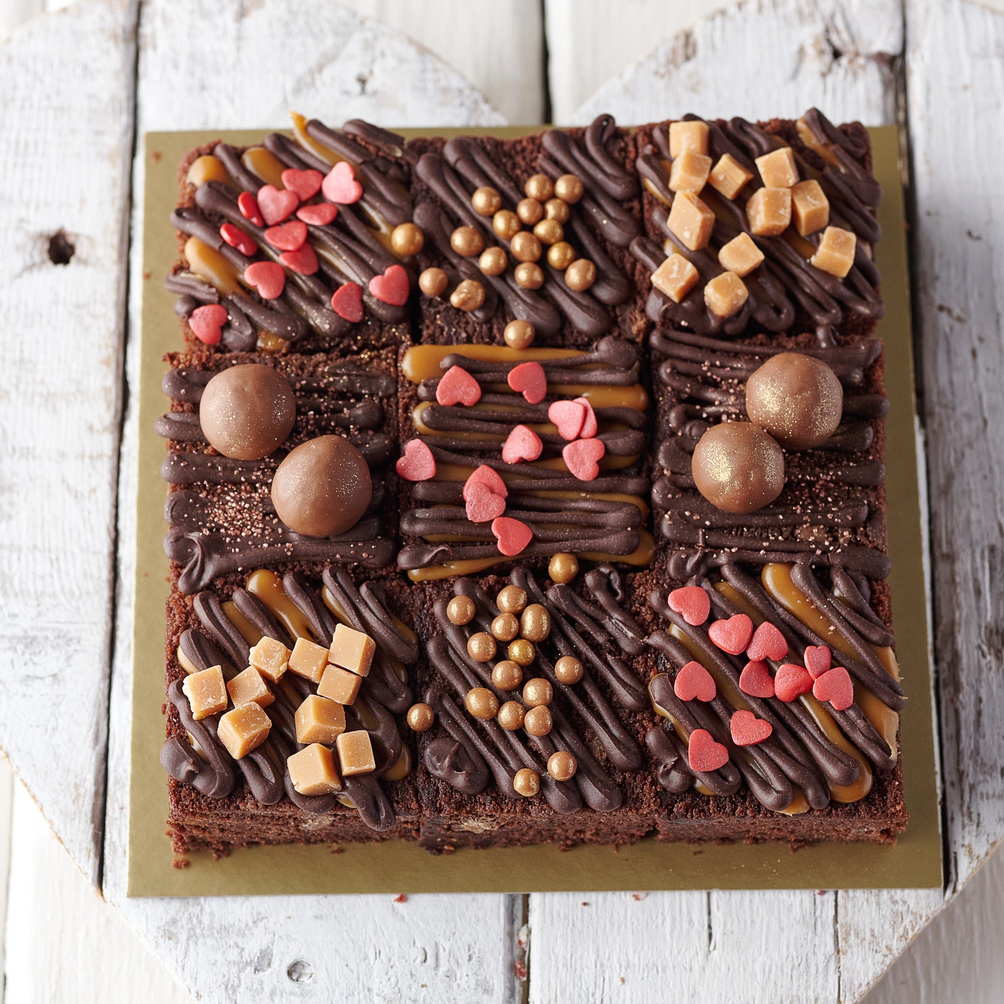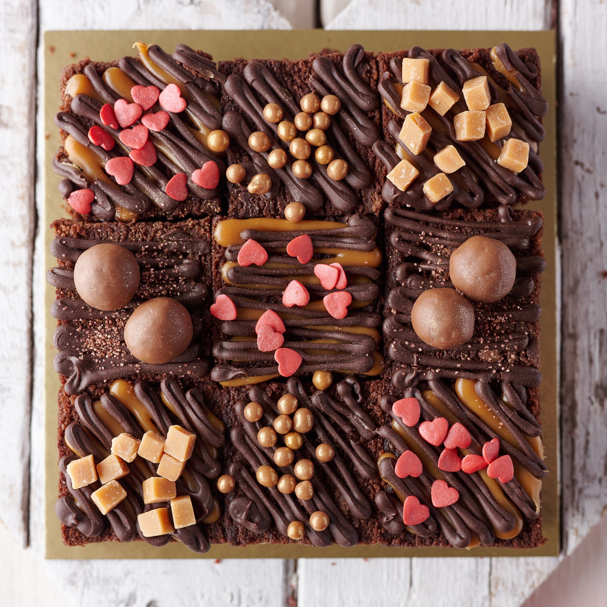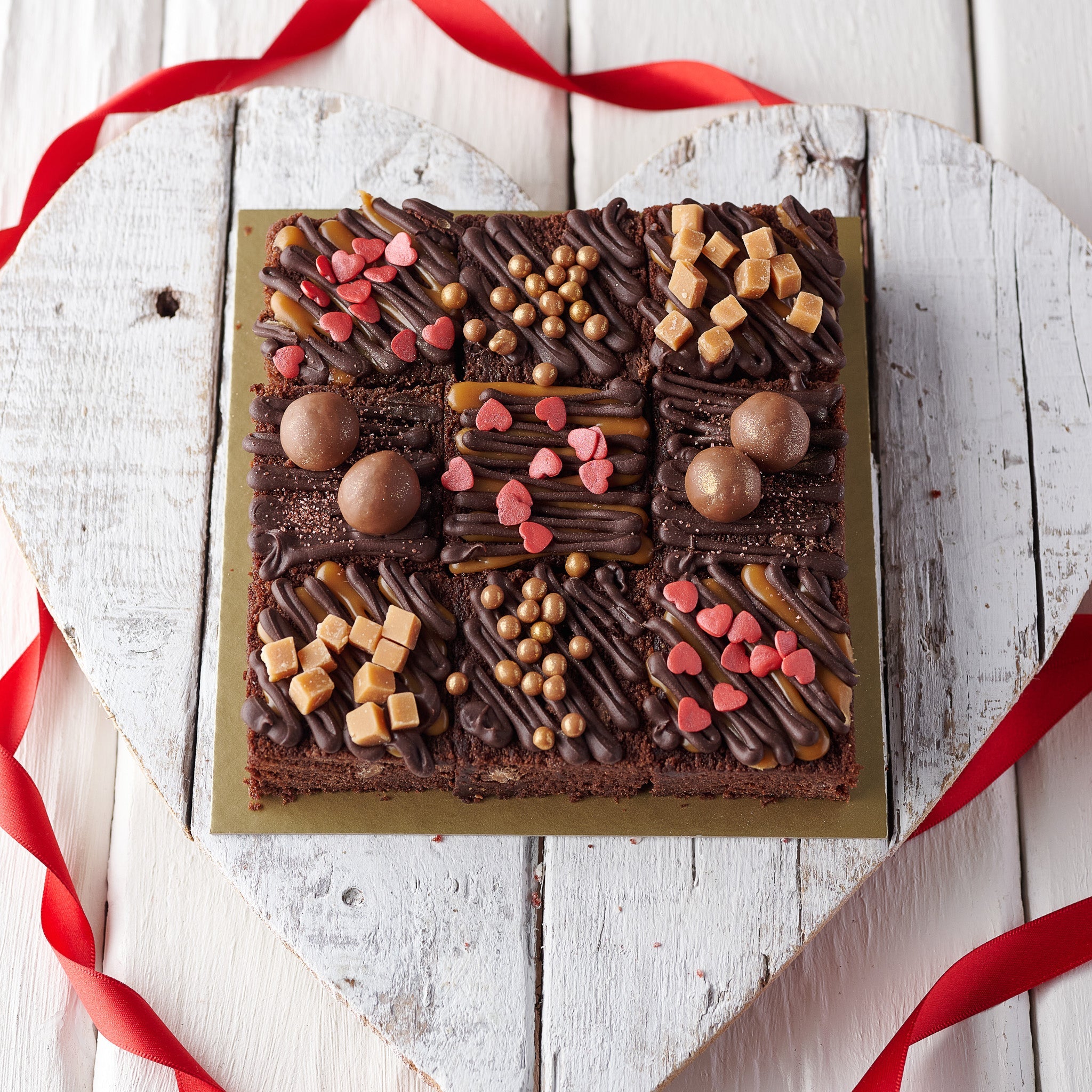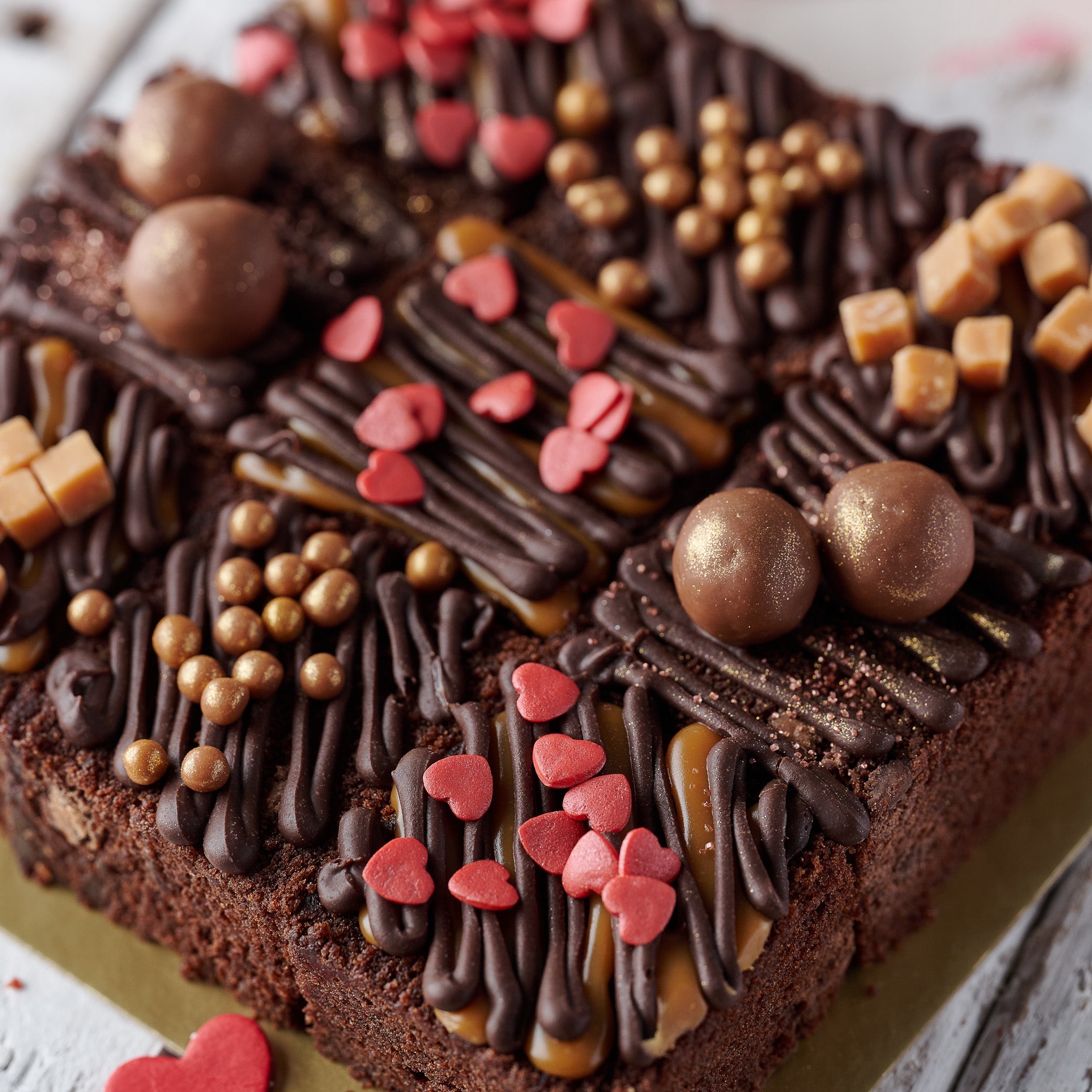 The perfect blend of rich chocolate cake and fudgy brownie, crafted into 9 individual squares for sharing or gifting. Each square is hand-decorated with drizzles of gooey caramel and smooth Belgian chocolate, then topped with chunks of fudge, malt balls, and heart sprinkles. A treat designed to impress, these bites are perfect for Valentine’s celebrations or as a thoughtful gift for someone special.