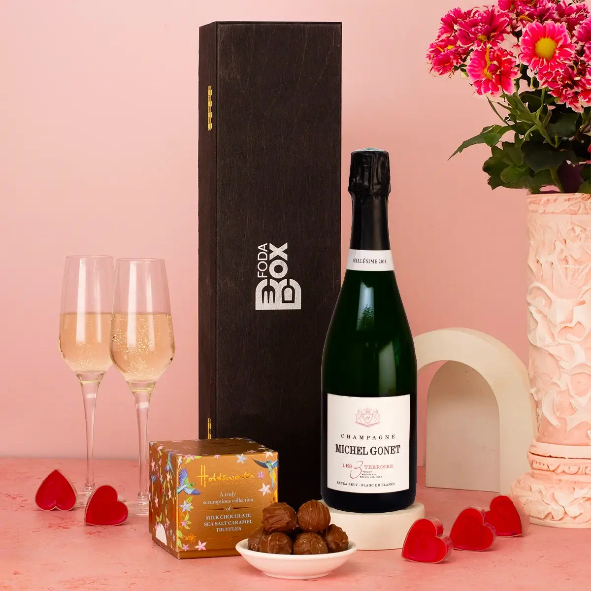 This Champagne and Truffles Gift is shipped in one of our signature sustainable wooden boxes.