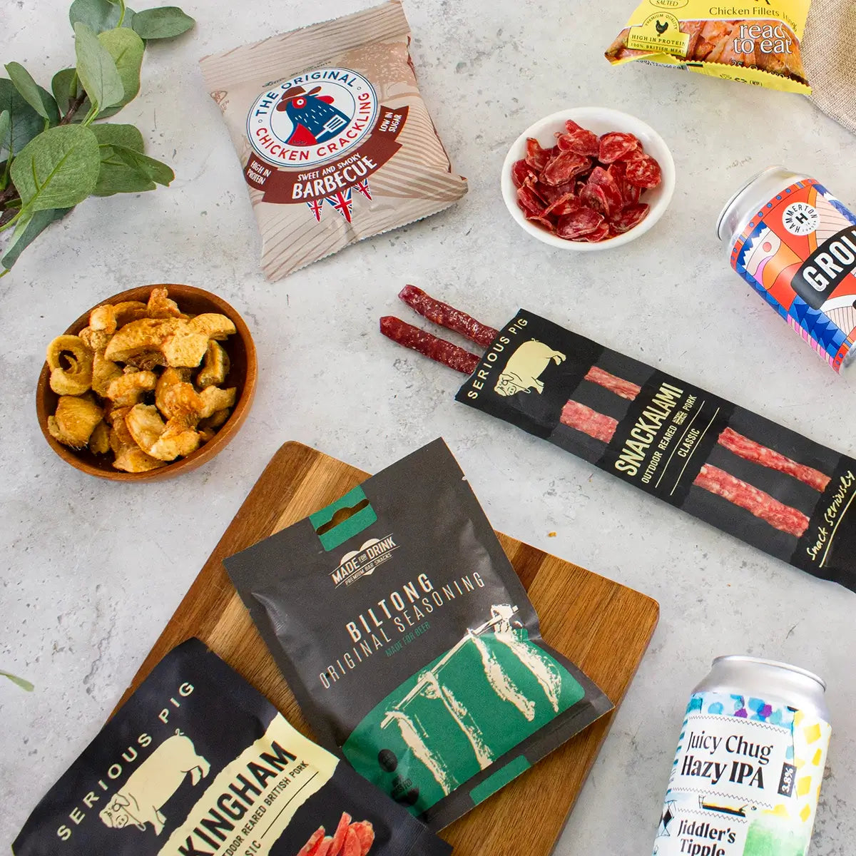 Delicious Meat Snacks: What's a pub visit without some mouthwatering snacks? Our gift box packs in six delectable meat snacks, including Gruntled's Habanero Chilli pork crackling, Serious Pig's Classic Snackingham and Wild Fenel Snackalami, Made for Drink's Biltong, Protermars Chicken Snacks, and Little Bobby Jebbs Chicken Crackling BBQ. These snacks are the perfect accompaniment to the beers, offering a taste of pub grub at its finest.