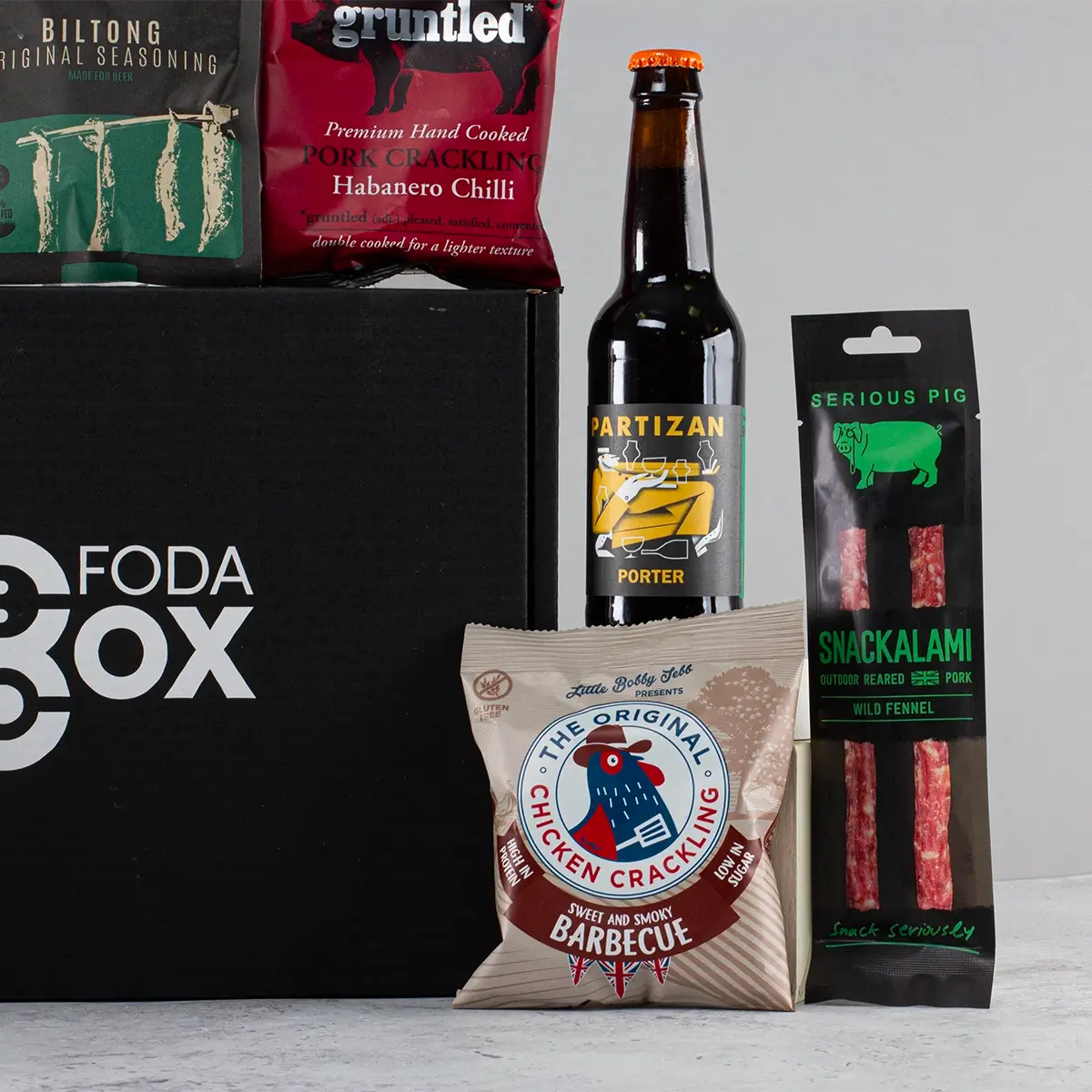 Introducing our FodaBox Craft Beer and Meat Snacks Gift Box, the perfect gift for any meat-loving beer connoisseur. It's the ultimate way to bring the classic pub experience right to their doorstep, creating a virtual pub in a box. This gift combines the best of craft beers with savoury and meaty snacks! Anyone who appreciates good beer and meaty snacks will love crunching on the moreish meaty treats in this beer gift all while sipping on an ice-cold beer.