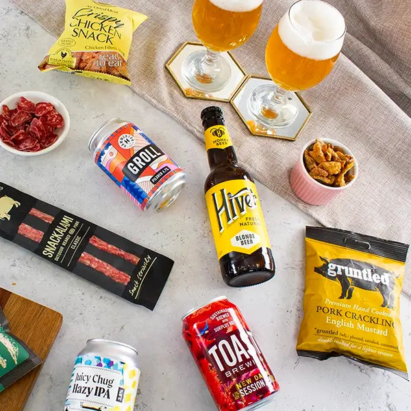 Virtual Pub Experience: Whether you're celebrating a special occasion or simply craving a relaxing evening at home, our beer and snacks gift box delivers the vibe of your favourite local pub. Enjoy the camaraderie, laughter, and flavour, all from the comfort of your own living room.
