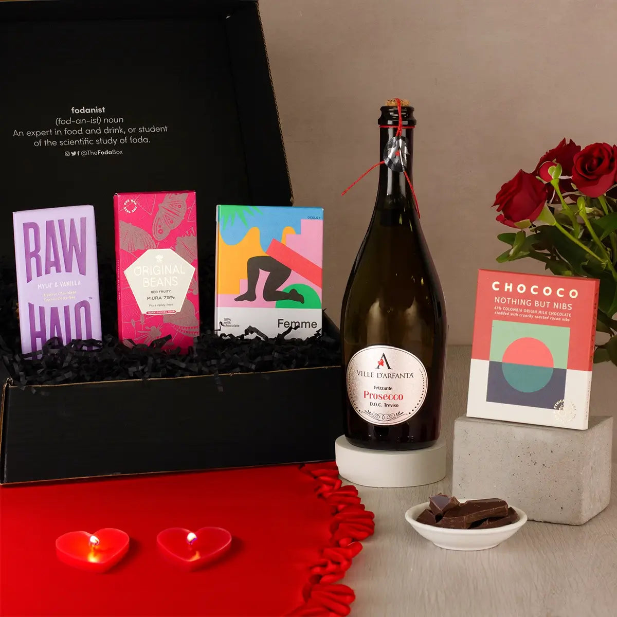 This combination of prosecco and chocolate make this gift box the perfect treat for those who love the finer things. Drawing on the prosecco's peachy undertones, each of the three bars of artisan chocolate included have been chosen for their flavour, and as an excellent accompaniment to the chilled fizzy prosecco.