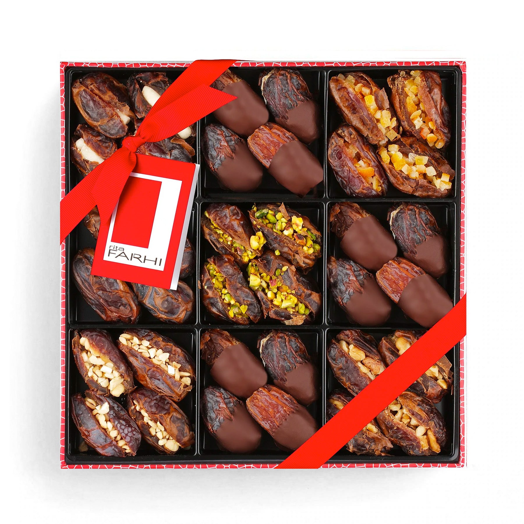 Experience the ultimate indulgence with our luxury chocolate covered Medjool dates, a perfect blend of natural sweetness and rich flavors. These exquisite dates are meticulously filled with unique and sumptuous ingredients, including zesty orange peels, creamy marzipan, and a selection of premium nuts like pistachios, cashews, almonds, and walnuts. Each date is hand-dipped in premium dark Belgian chocolate, creating a decadent treat that's both vegan-friendly and irresistibly delicious. Presented in our signature gift box, this gourmet assortment is an ideal centerpiece for any dining table or a thoughtful gift for occasions like Ramadan, Eid, birthdays, or simply to show your appreciation.