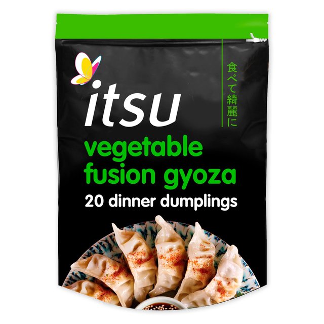 Gyoza Filling: Water, Tofu* (11%) (Water, Soya Beans), High Protein Soya Mince, Finely Shredded Carrot (10%), Shaved Leek (8%), Green Onion (7%), White Onion (7%), Sweet Cabbage (5%), Sweet Potato Noodles (Sweet Potato Starch, Water), Corn Oil, Soy Sauce (Soya Beans, Wheat, Water, Salt, Alcohol), Toasted Sesame Oil, Sugar, Seasoning Oil (Canola Oil, Onion Flakes, Antioxidant: Tocopherol (Vitamin E), Onion Oil), Ginger, Crushed Garlic, Soy Protein Isolate* (to bind) (Soya Protein), salt, Soy Seasoning (Soya Beans, Yeast, Salt, Wheat [Gluten], Maltodextrin, Yeast Extract, Dextrin, Vinegar) Black Pepper, Gyoza Skin: Wheat Flour (Gluten), Water, Salt, Seasoned Soy Dipping Sauce: Soy Sauce (65%) (Soya Bean, Wheat [Gluten], Water, Salt), Vinegar, Sugar, Red Pepper Extract (Red Pepper Powder, Alcohol, Sugar, Water, Salt), *all Tofu contains Firming Agents (Nigari (E511) and Calcium Sulphate), to give it the perfect texture, **a high quality plant-based Protein made from all natural ingredients, loved by Vegans
