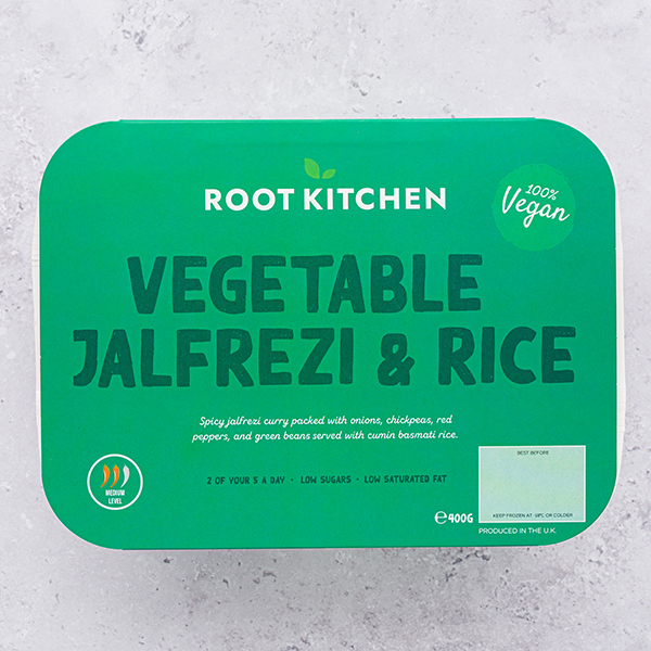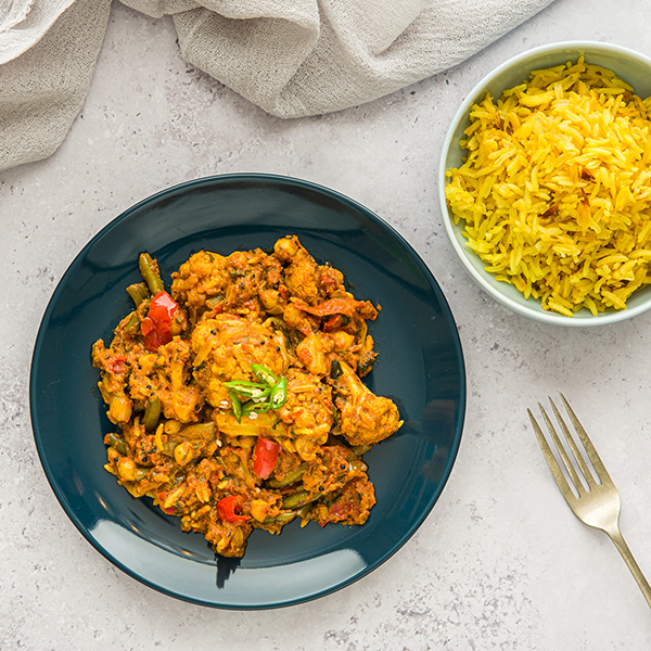 Spicy jalfrezi curry packed with onions, chickpeas, red peppers, and green beans served with cumin basmati rice. Meal for one: 400g