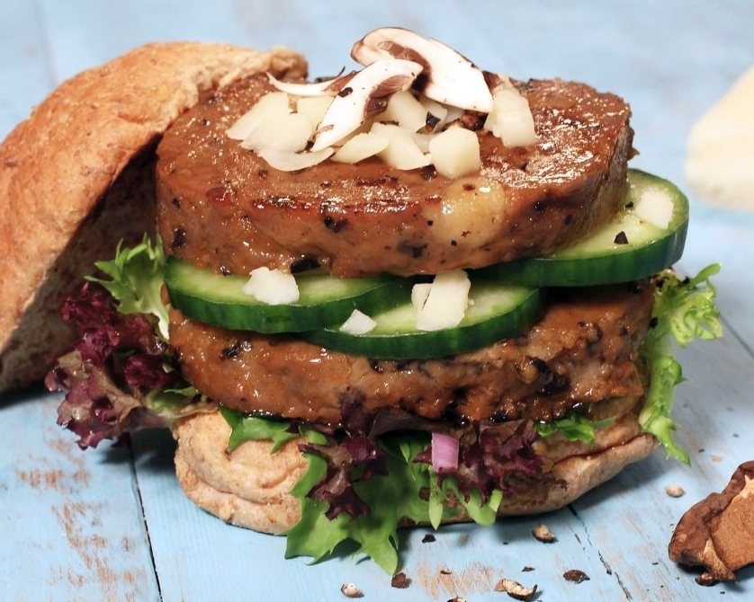 Porcini and other mushrooms give the Swiss vegan Burger a delicate mushroomy taste. The burger is refined with pieces of No-Moo, Classic which gives its characteristic flavour.