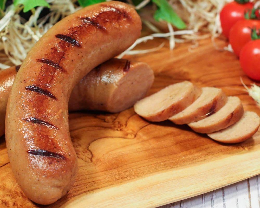 Swiss vegan sausage, firm in bite and smokey taste. Well cooked for hot and cold eating.