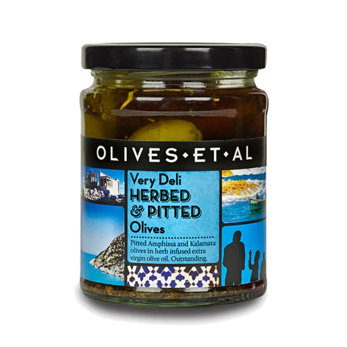 Pitted Amphissa and Kalamata olives in herb-infused extra virgin olive oil.