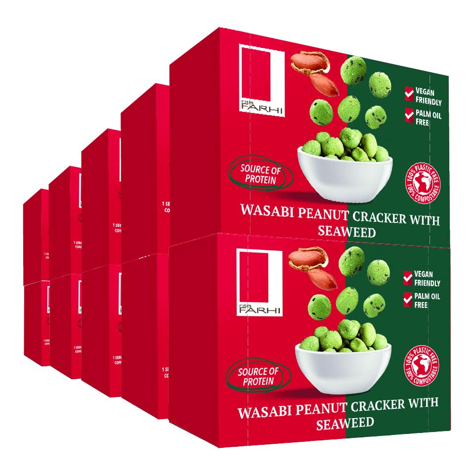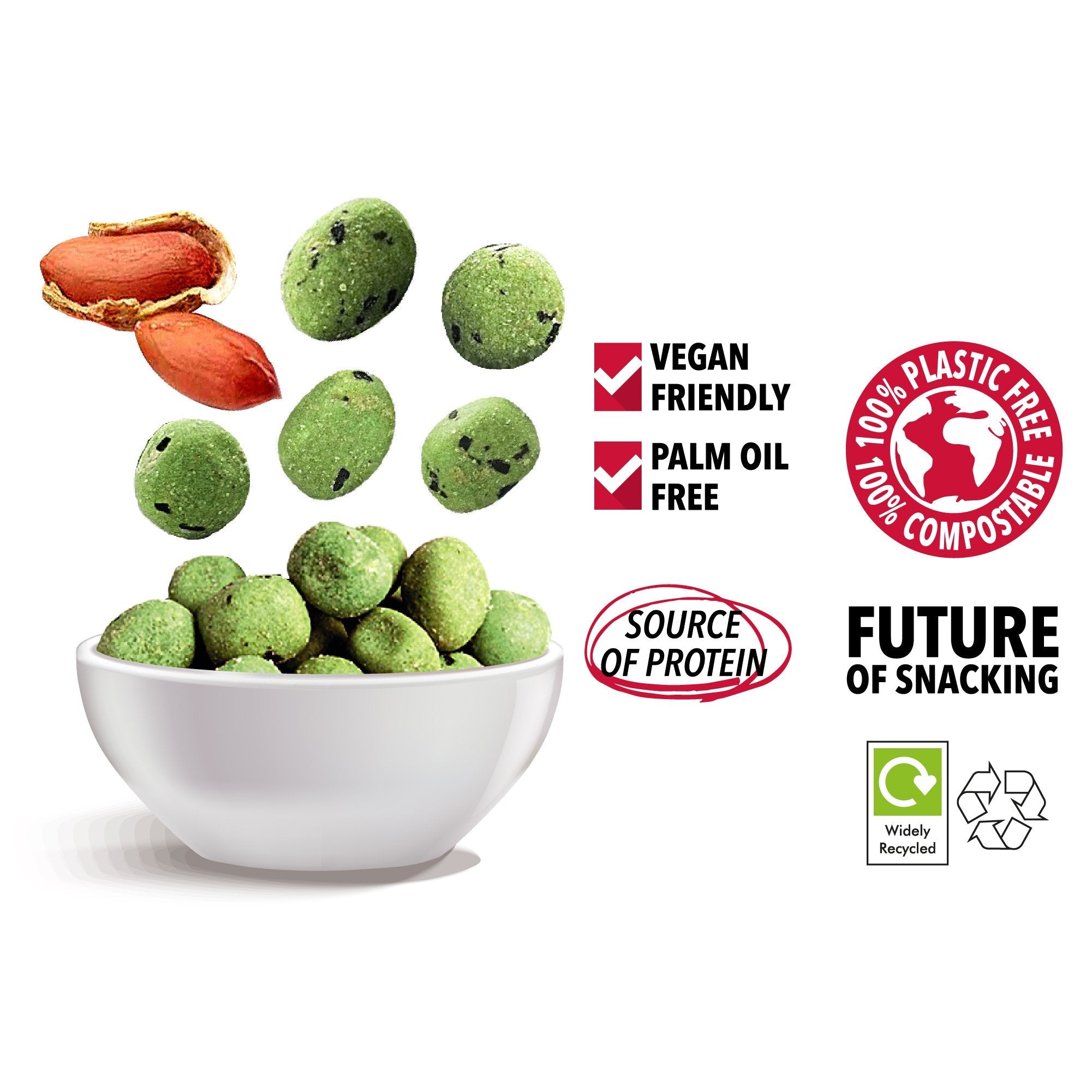 Crunchy peanuts encased in a crisp, spicy wasabi and seaweed cracker coating. Great for a protein packed treat or flavourful salad topper. Presented in our eco-friendly, handy, snack-box format for a delicious spicy nibble on the go.
