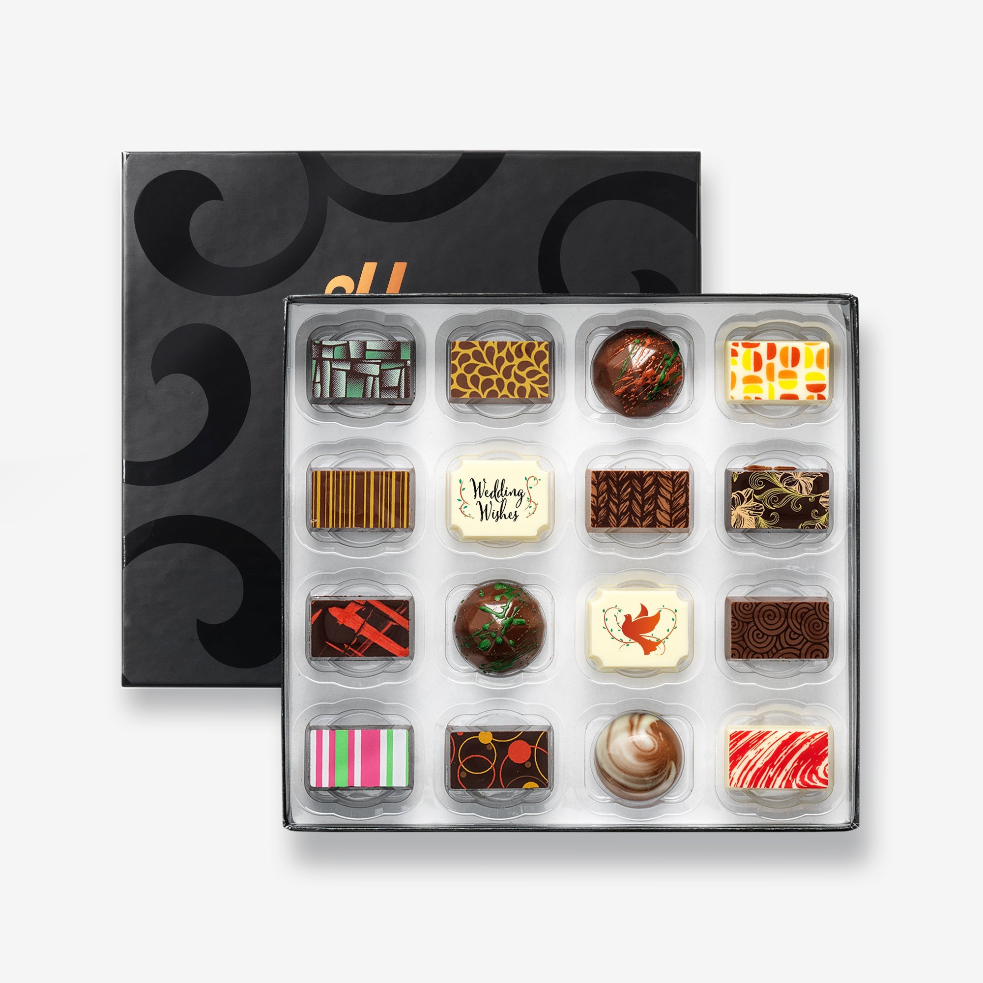 A luxury selection box of 16 filled artisan chocolates, featuring two special 'Wedding Wishes' themed chocolates. Made with natural ingredients and hand-decorated with cocoa butter.