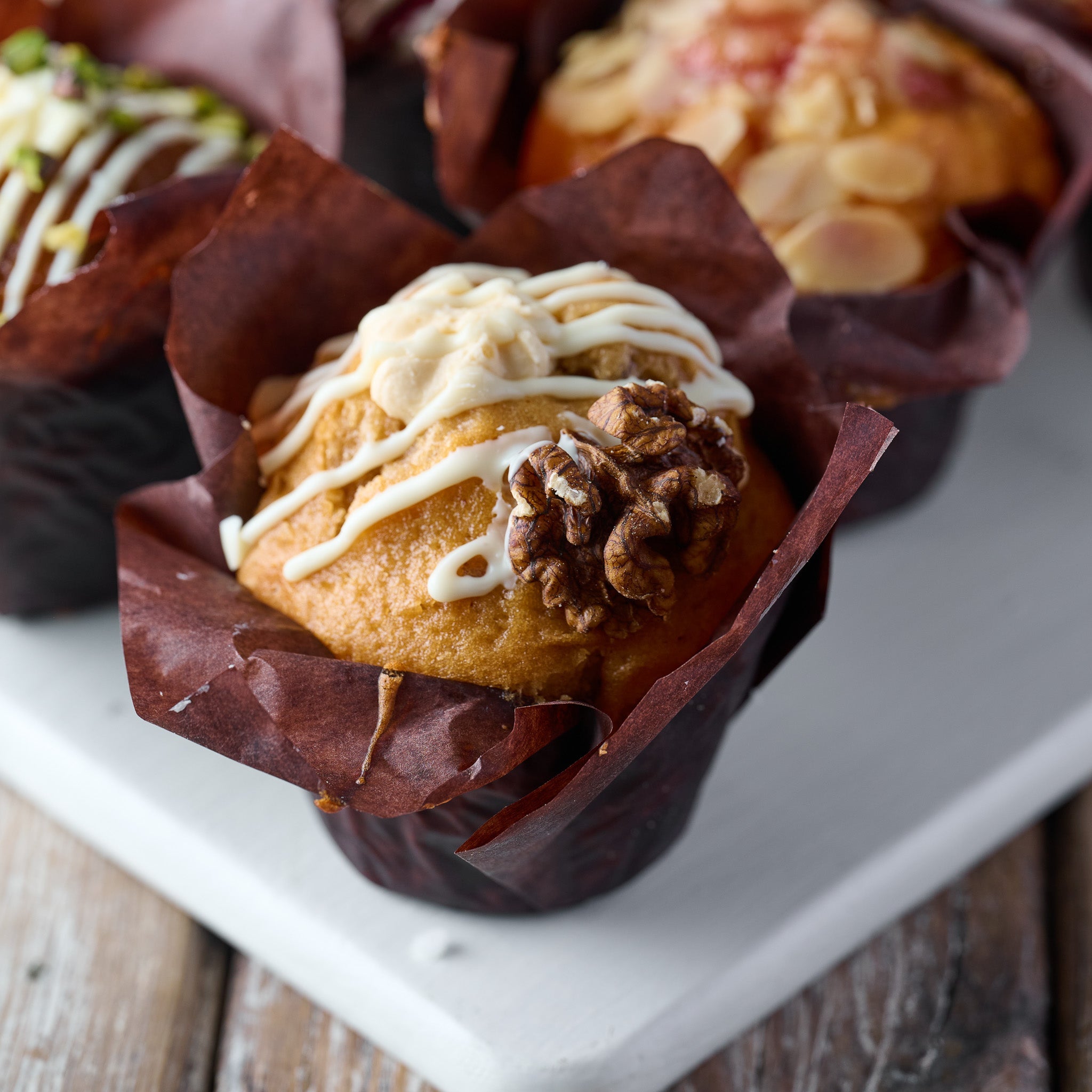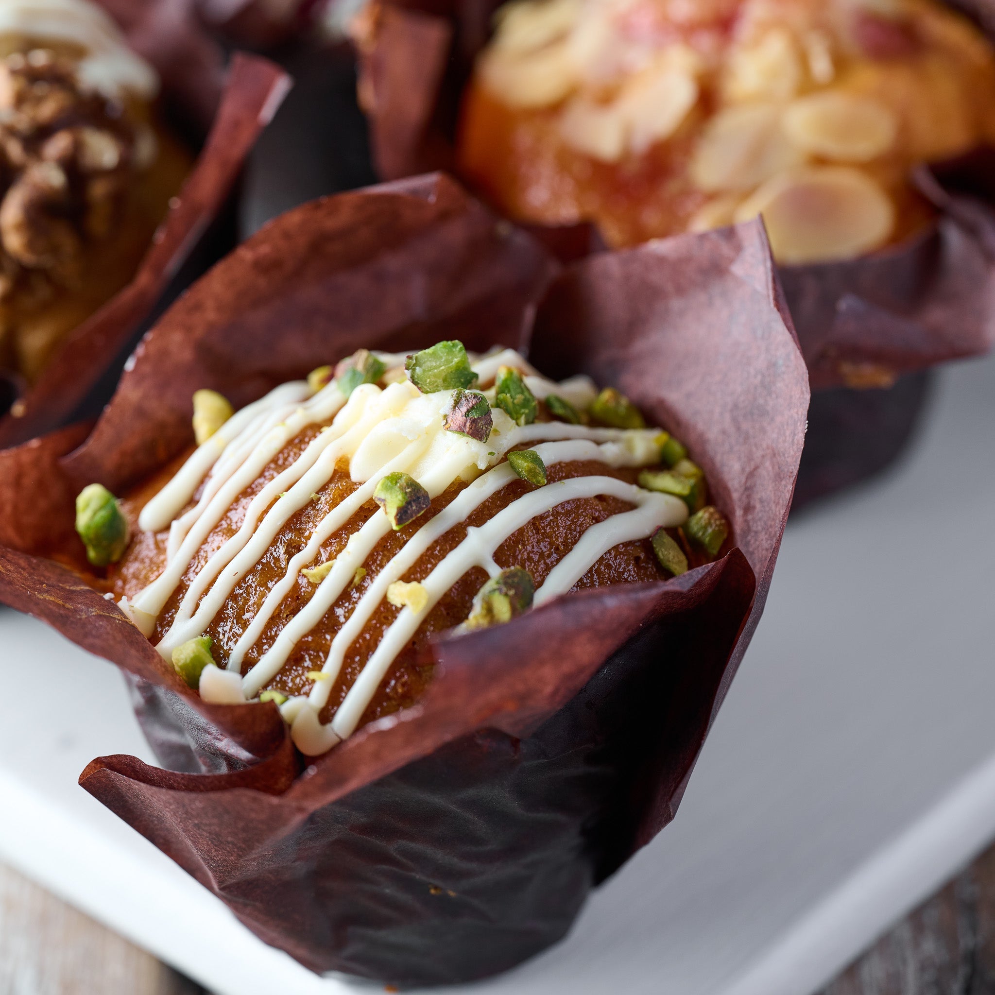 ✔ 2 x Carrot Cake Muffin – Spiced sponge with treacle, carrots, and walnuts, filled with cream cheese frosting and topped with a white chocolate drizzle and pistachio pieces.