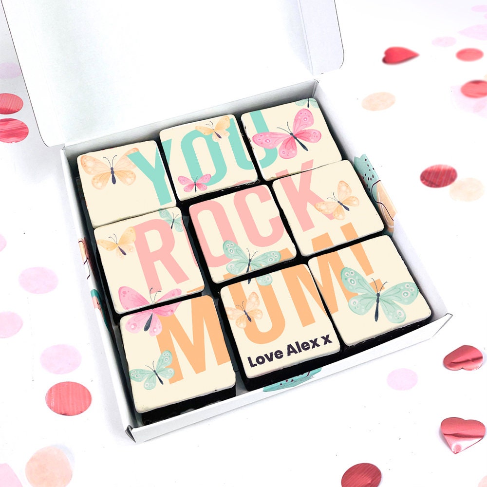 Show Mum she rocks with bakerdays' 'You Rock' Mother's Day brownies! This indulgent treat features 9 squares of rich, fudgy goodness, delivering a perfect blend of sweetness and sentiment. Delivered across the UK, these personalized brownies are a delightful way to express love and appreciation. Surprise and sweeten the special women in your life with bakerdays – because every mum deserves a taste of rockstar-worthy treats! Whatever the occasion we guarantee only the best tasting gifts for you and your loved ones, and it stays fresh for up to 14 days. Make sure to leave it in a cool and dry place, Not in the fridge.