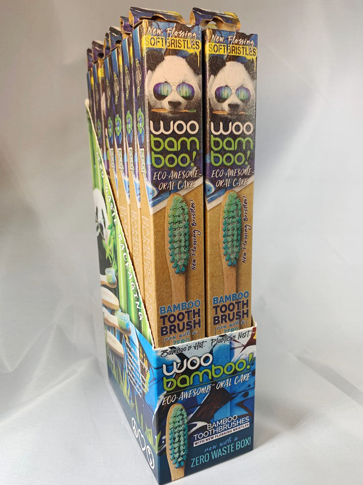 Same bamboo toothbrushes with new plastic-free, biodegradable box with soy-based ink! We know...we're excited too! WooBamboo's bamboo toothbrushes are not only dentist-approved, but also Mother Nature recommended. Like all WooBamboo brushes, it touts a beautiful handle made from a single piece of hand-carved, naturally-grown bamboo, containing no toxins, glues, or paints. The handle of this tooth...